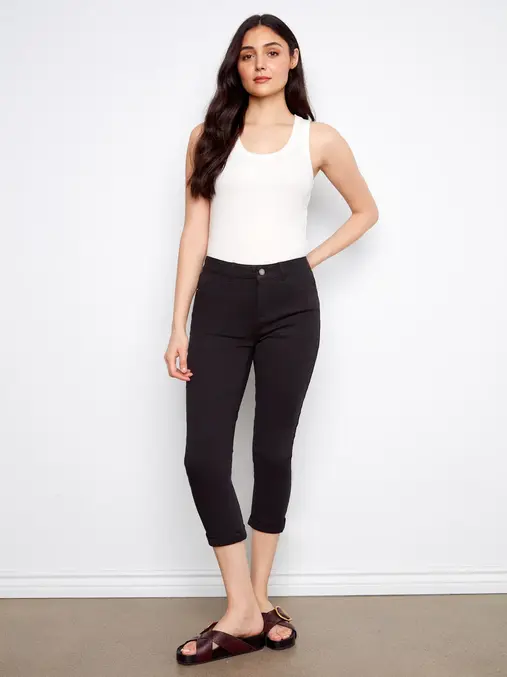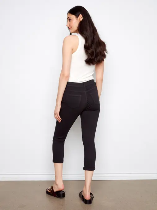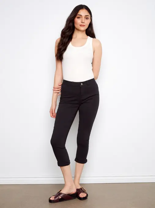 Embrace easy, everyday style with our black slim cropped pants. Crafted from comfortable stretch twill, they offer a flattering fit with effortless movement, while the cuffed hem adds a relaxed, modern touch. Perfect for workdays or casual outings, these versatile essentials transition smoothly from day to night. A go-to staple for your spring-summer wardrobe.