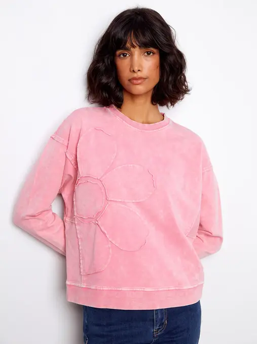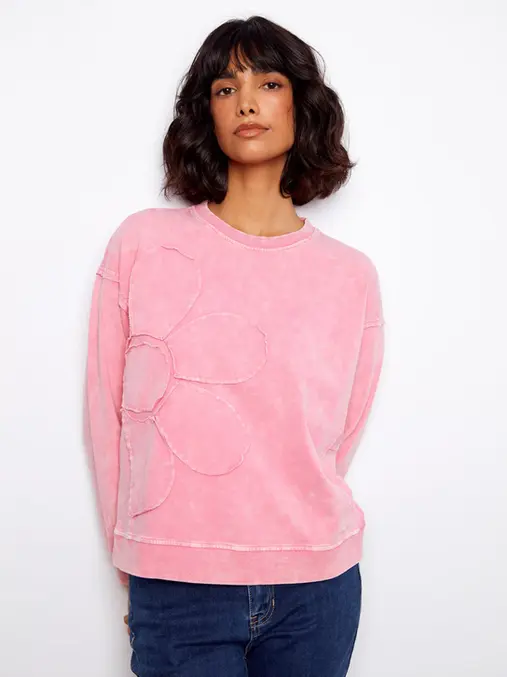 Embrace effortless style with our long sleeve candy pink top, featuring a charming flower applique on the front. Designed with a classic crew neckline, drop shoulders, and ribbed neck and cuffs, this top offers a comfortable fit. Crafted from stretchy cotton, it moves with you for all day ease.