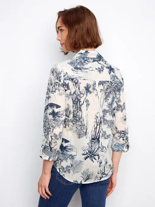 Refresh your spring wardrobe with our Printed Cotton Voile Button-Up Blouse, adorned with a beautiful Versailles print in dark blue that flows gracefully across the fabric. Featuring a shirt collar and long sleeves, this blouse exudes effortless elegance, while its lightweight, breathable cotton ensures all-day comfort. Perfect for any occasion, it’s a must-have piece for the season.