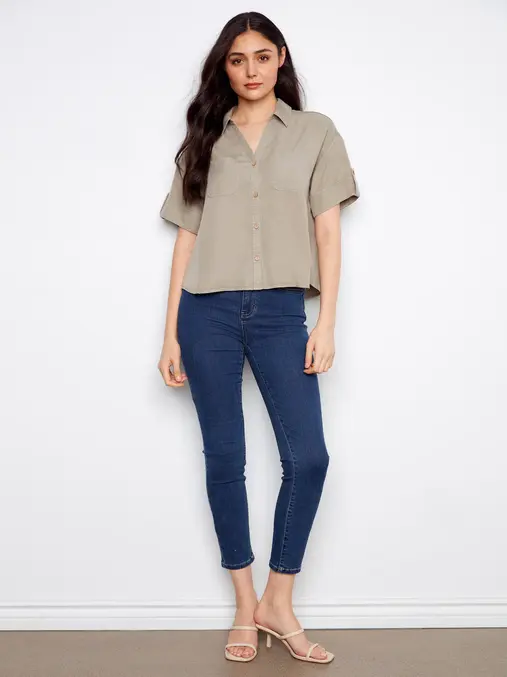 Elevate your spring wardrobe with our sage green Tencel Blouse, where effortless style meets lightweight comfort. Featuring a classic shirt collar and convenient patch pockets, it offers a relaxed yet flattering silhouette. This versatile staple is an absolute must-have for any fashion-forward wardrobe.