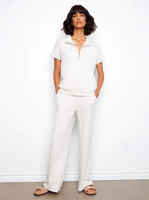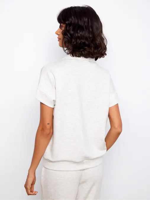 Elevate your everyday style this spring with our Heather Light Grey Soft Scuba Top. Featuring a chic half-zip mock neck, short sleeves, and playful white blanket-stitch detailing, this versatile top pairs effortlessly with any bottoms for a polished, effortless look.
